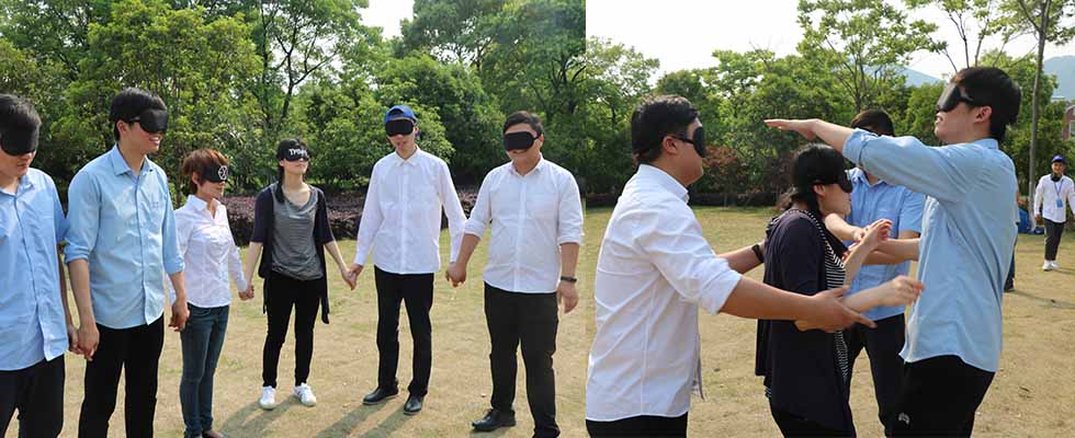 蒙上眼睛根据搭档的指挥走过障碍地,准确避开障碍物顺利到达终点。搭档的默契配合和相互信任,在这个游戏中发挥的淋漓尽致。