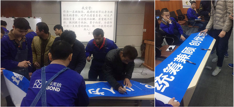 “十六字”目标的提出是为了增强生产中心管理人员的责任意识,规范管理行为,改进工作及管理作风,并将这种优良作风感染到每一个诺邦人,各车间主任及班组长也在“十六字”目标上签上了自己的名字,承诺为打造越来越好的诺邦而共同努力!