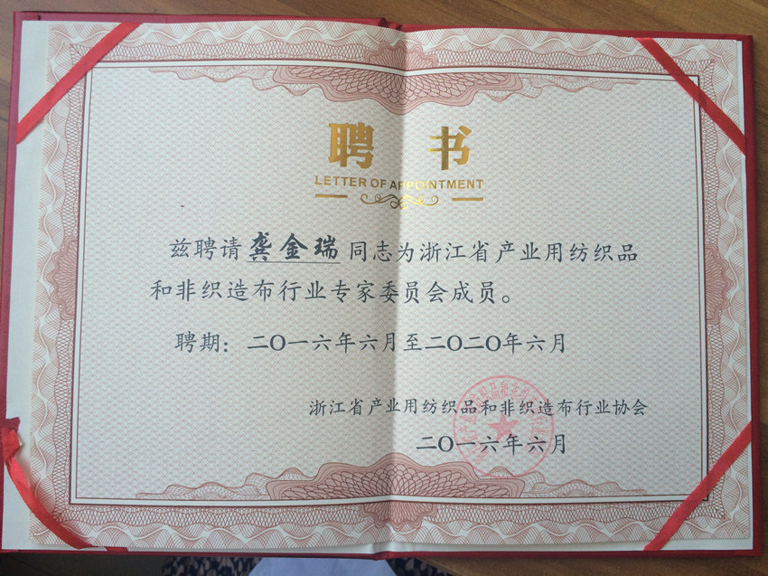 大会宣布浙江省产业用纺织品和非织造布行业专家组正式成立,我司龚金瑞先生被聘为浙江省产业用纺织品和非织造布行业专家委员会成员,大会为15位行业专家组成员颁发了聘书 。专家组的成立,让浙江的产业用纺织品和非织造布行业站位更加专业的视角、掌握更加权威的信息、开展更加全面的研究,努力突破瓶颈,带来全新发展。